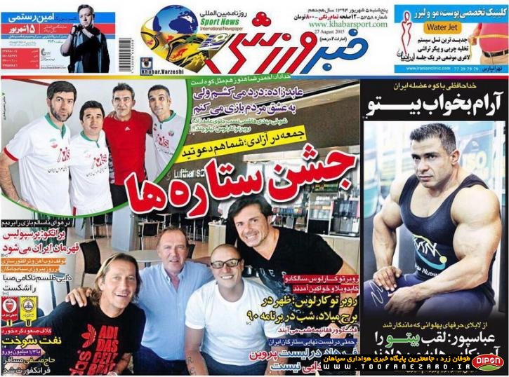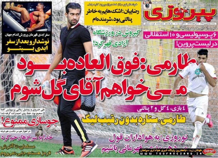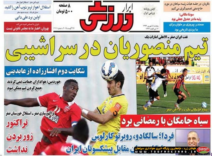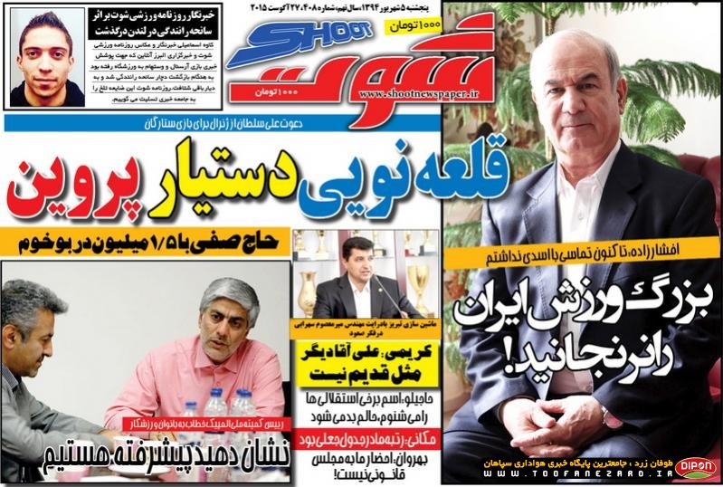 مطبوعات ورزشی کشور روزنامههای صبح پنجشنبه، 5 شهریور شامل صفحه یک روزنامههای: گل، خبر ورزشی، ابرار ورزشی، پیروزی، استقلال جوان، ایران ورزشی، شوت، هدف