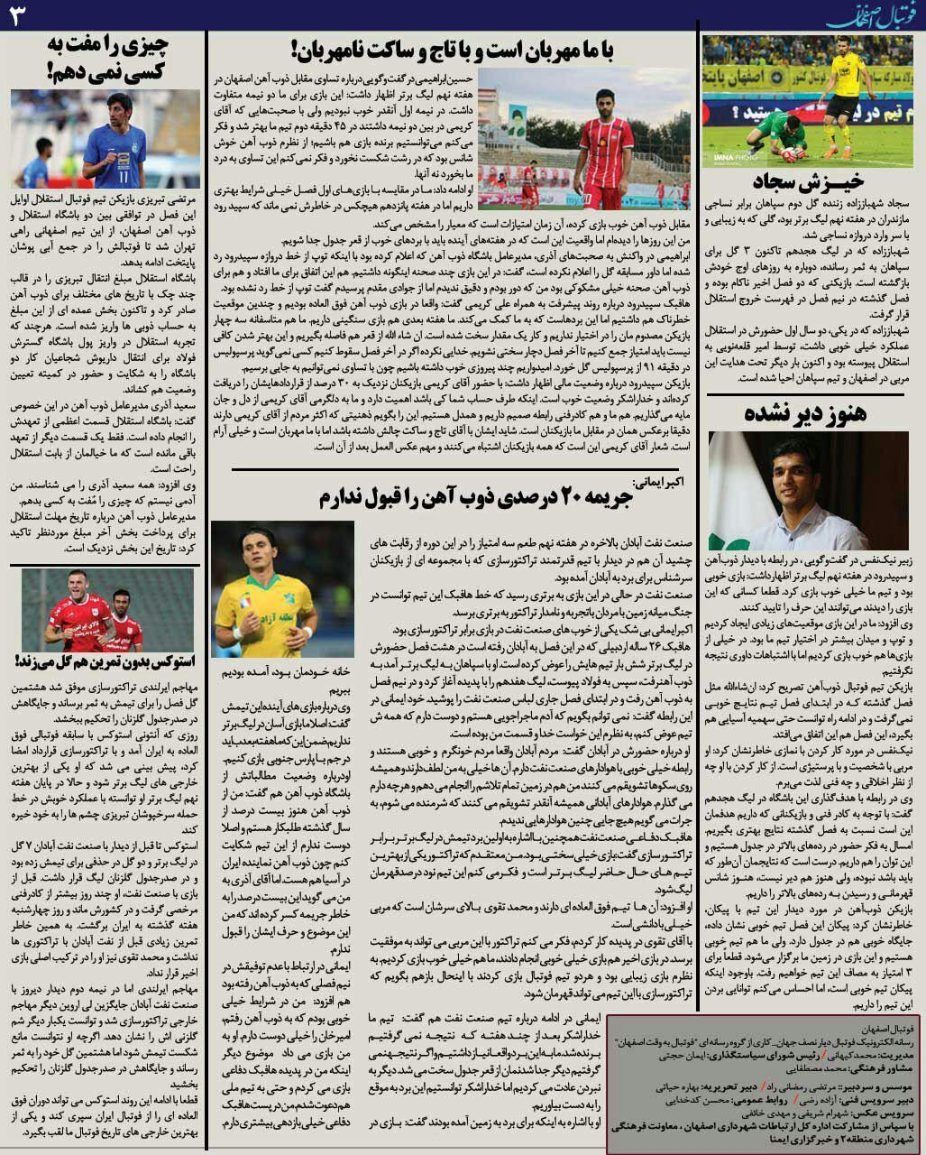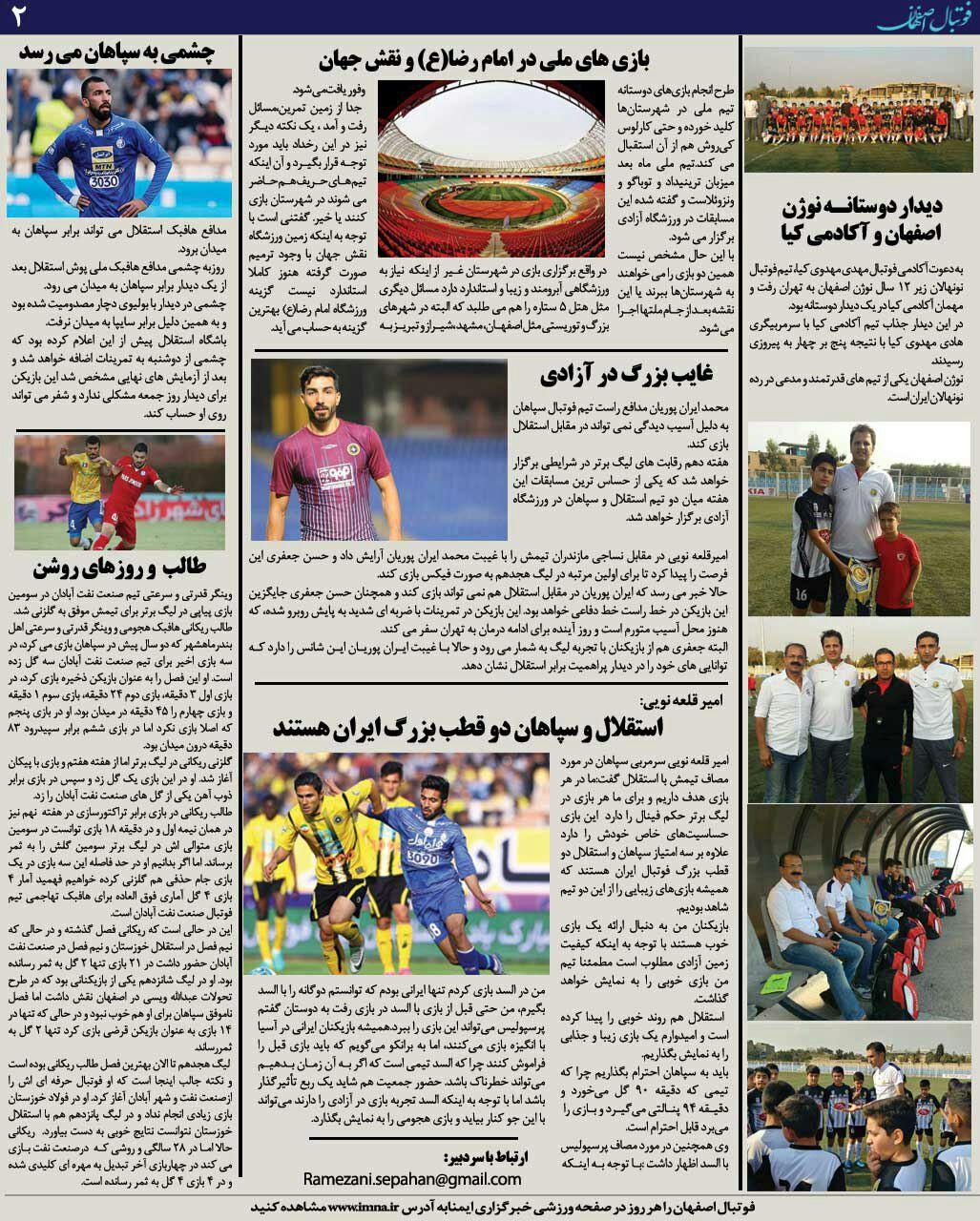 شماره45 روزنامه الکترونیک فوتبال اصفهان دوشنبه 30 مهر روزنامه الکترونیک فوتبال اصفهان دوشنبه 30 مهر97 با محوریت پوشش اخبار تیم های فوتبال سپاهان و ذوب آهن منتشر شد.