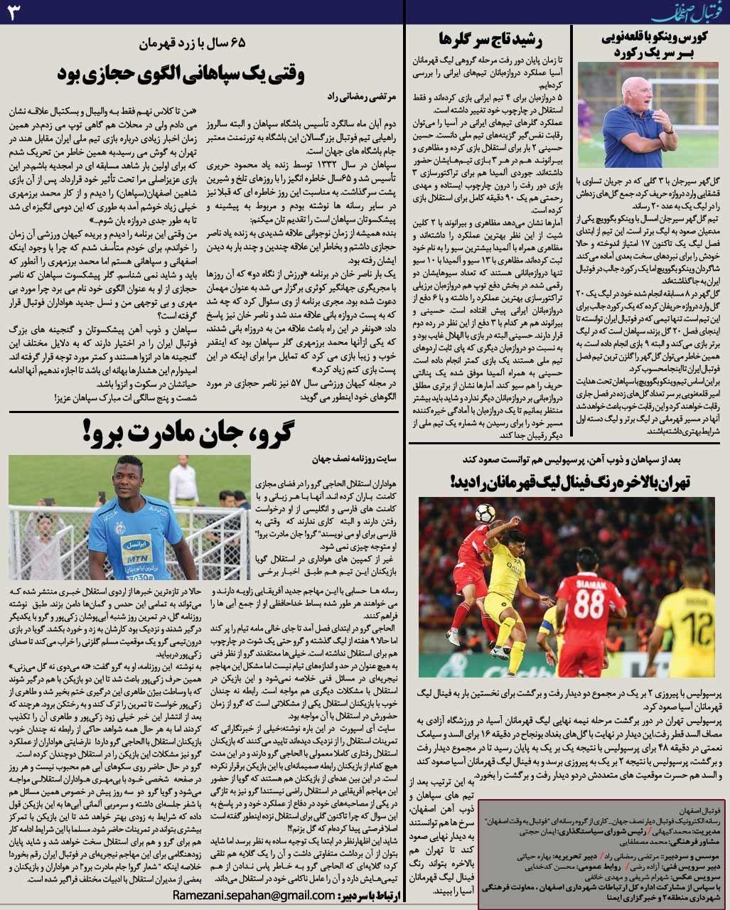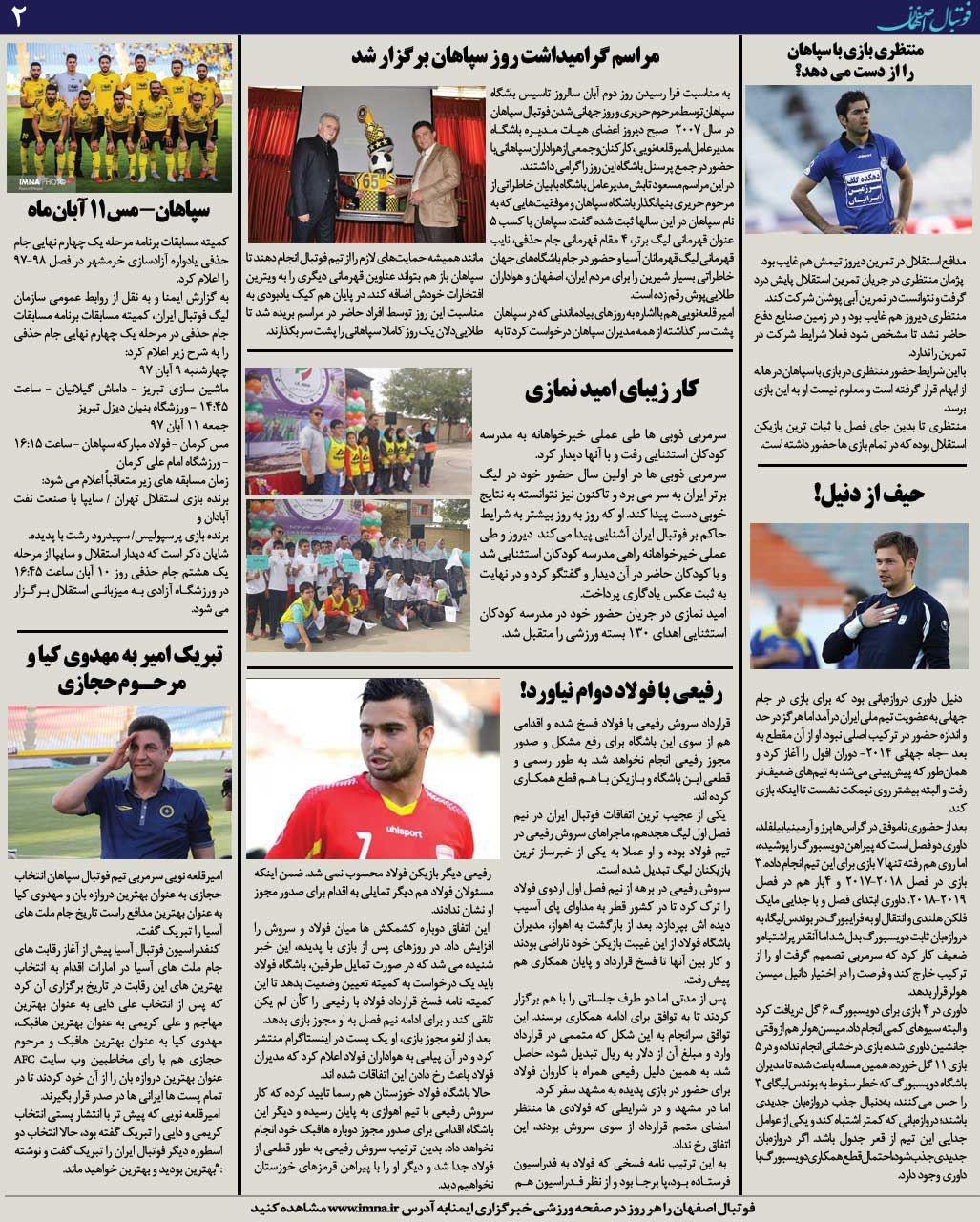 شماره 47 روزنامه الکترونیک فوتبال اصفهان چهارشنبه 2 آبان97 روزنامه الکترونیک فوتبال اصفهان چهارشنبه 2 آبان97 با محوریت پوشش اخبار تیم های فوتبال سپاهان و ذوب آهن منتشر شد.