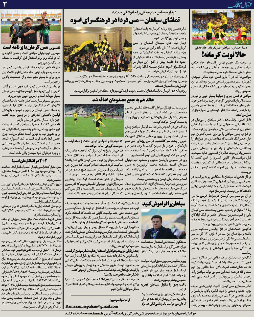 شماره53 روزنامه الکترونیک فوتبال اصفهان پنجشنبه 10 آبان97 روزنامه الکترونیک فوتبال اصفهان پنجشنبه 10 آبان97 با محوریت پوشش اخبار تیم های فوتبال سپاهان و ذوب آهن منتشر شد.