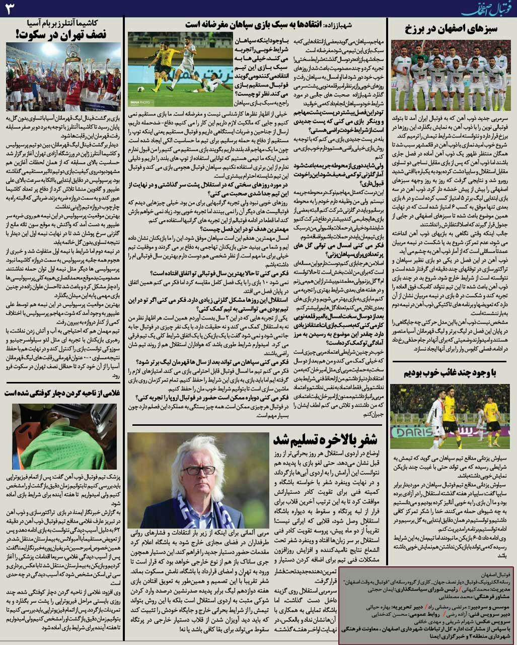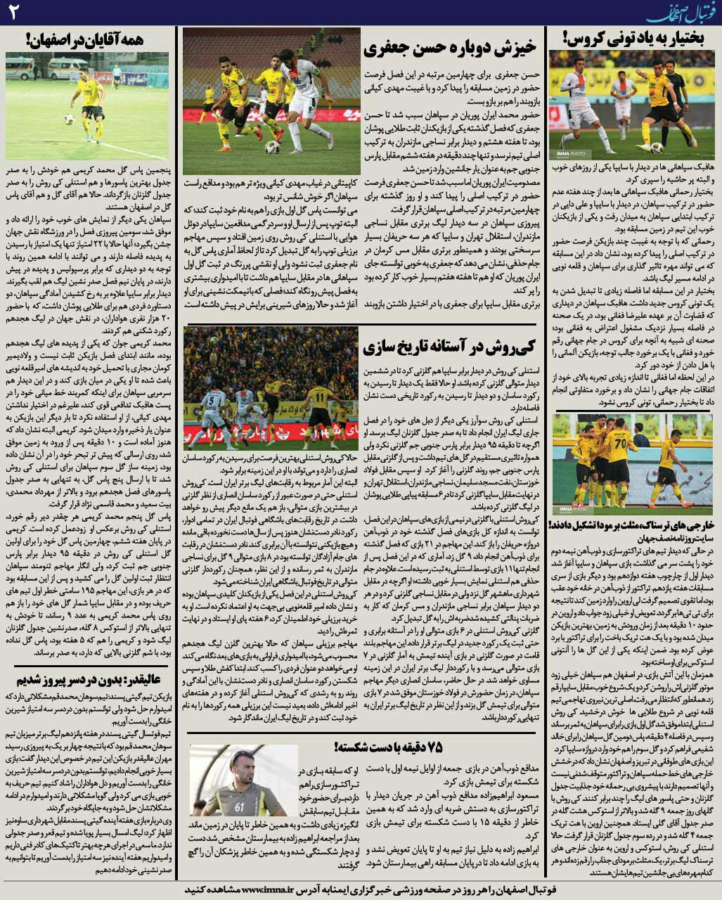 شماره59 روزنامه الکترونیک فوتبال اصفهان یکشنبه 20 آبان97 روزنامه الکترونیک فوتبال اصفهان یکشنبه 20 آبان97 با محوریت پوشش اخبار تیم های فوتبال سپاهان و ذوب آهن منتشر شد.