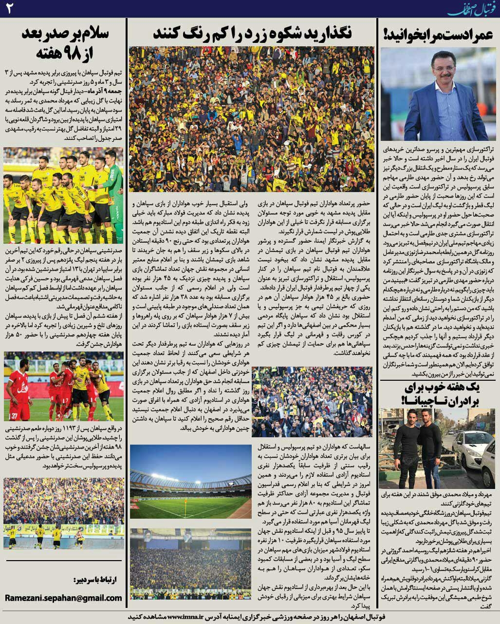 شماره74 روزنامه الکترونیک فوتبال اصفهان یکشنبه 11 آذر97 روزنامه الکترونیک فوتبال اصفهان یکشنبه 11 آذر97 با محوریت پوشش اخبار تیم های فوتبال سپاهان و ذوب آهن منتشر شد.
