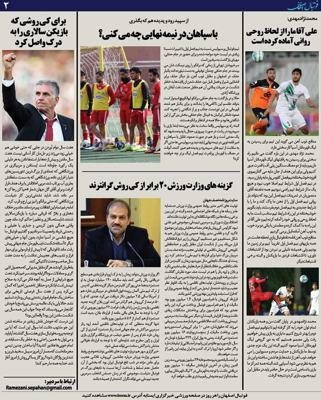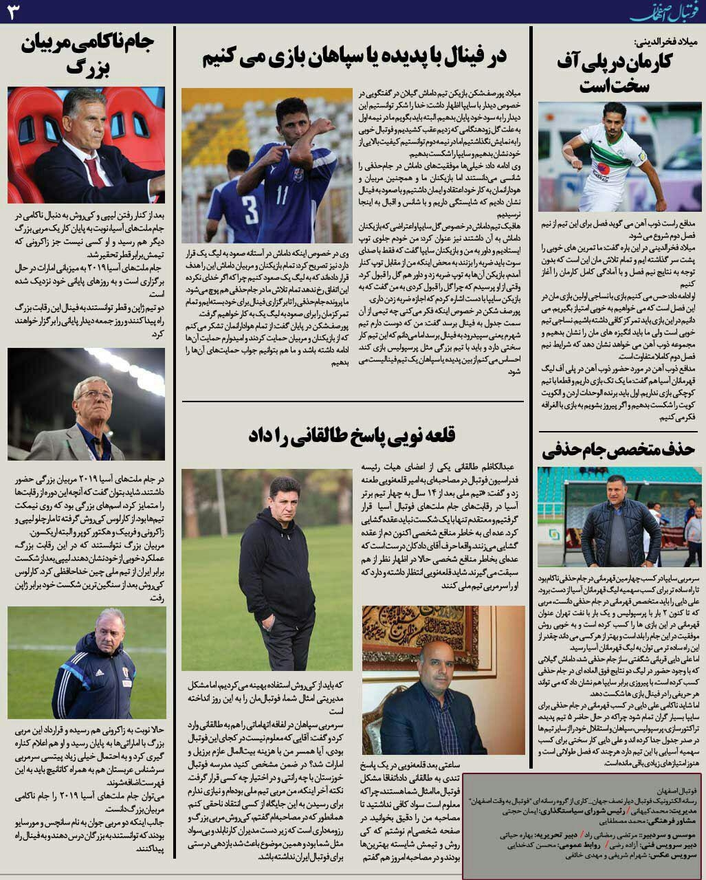 شماره125 روزنامه الکترونیک فوتبال اصفهان پنجشنبه 11بهمن 97 روزنامه الکترونیک فوتبال اصفهان پنجشنبه 11بهمن 97با محوریت پوشش اخبار تیم های فوتبال سپاهان و ذوب آهن منتشر شد.