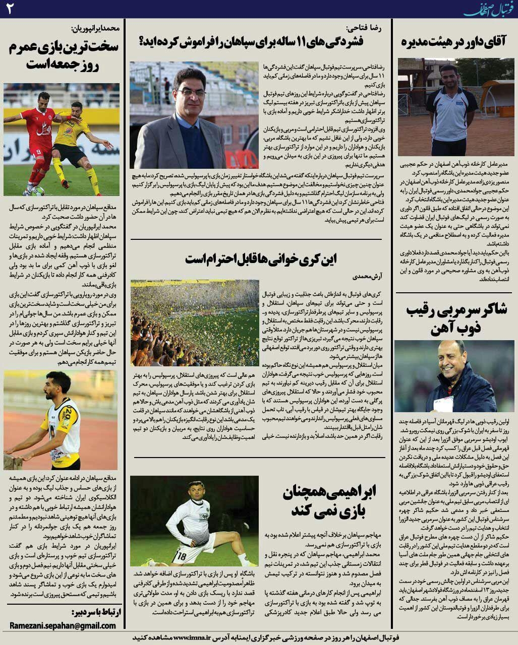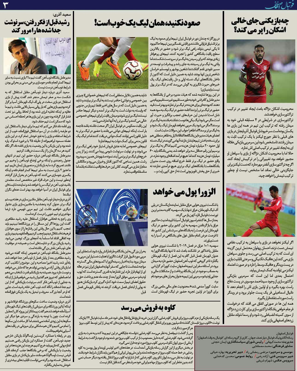 شماره146 روزنامه الکترونیک فوتبال اصفهان چهارشنبه8 اسفند 97 روزنامه الکترونیک فوتبال اصفهان چهارشنبه8 اسفند 97 با محوریت پوشش اخبار تیم های فوتبال سپاهان و ذوب آهن منتشر شد.