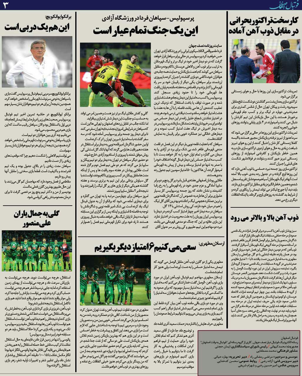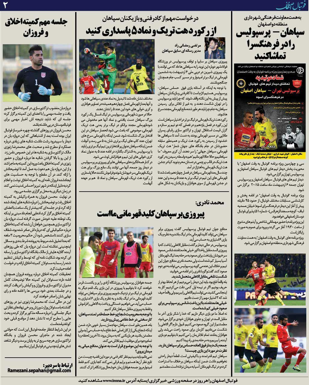 شماره180 روزنامه الکترونیک فوتبال اصفهان پنجشنبه5 اردیبهشت 98 روزنامه الکترونیک فوتبال اصفهان پنجشنبه5 اردیبهشت 98 با محوریت پوشش اخبار تیم های فوتبال سپاهان و ذوب آهن منتشر شد.