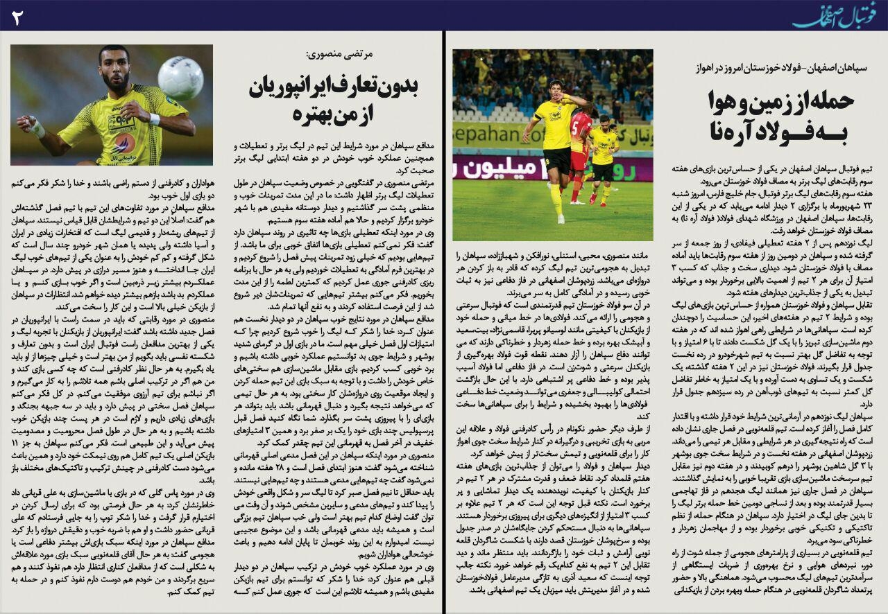 شماره291 روزنامه الکترونیک فوتبال اصفهان شنبه23شهريور 98 روزنامه الکترونیک فوتبال اصفهان شنبه23شهريور 98 با محوریت پوشش اخبار تیم های فوتبال سپاهان و ذوب آهن منتشر شد.
