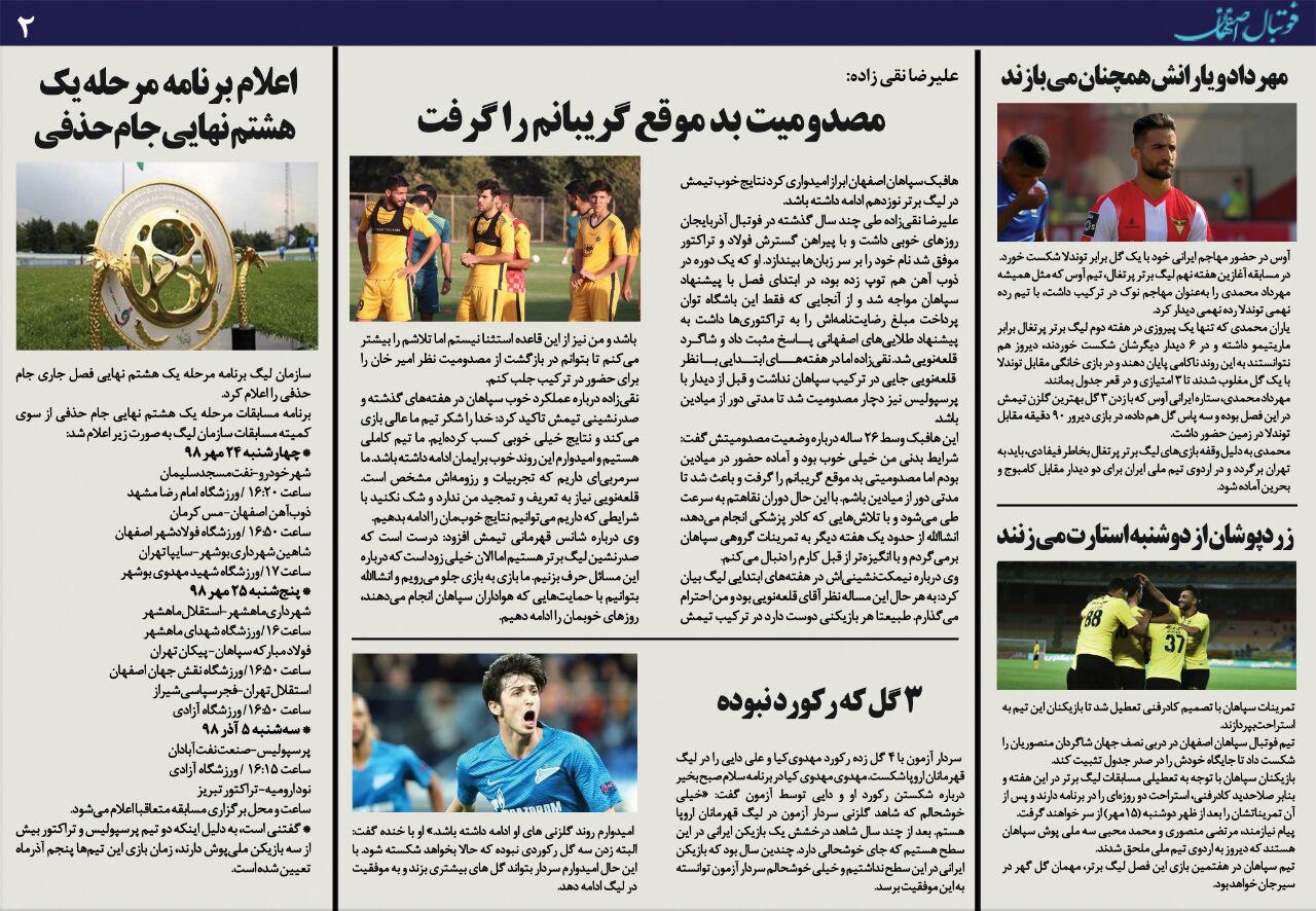 شماره 310 روزنامه الکترونیک فوتبال اصفهان یکشنبه 14مهر 98 روزنامه الکترونیک فوتبال اصفهان یکشنبه 14مهر 98 با محوریت پوشش اخبار تیم های فوتبال سپاهان و ذوب آهن منتشر شد.