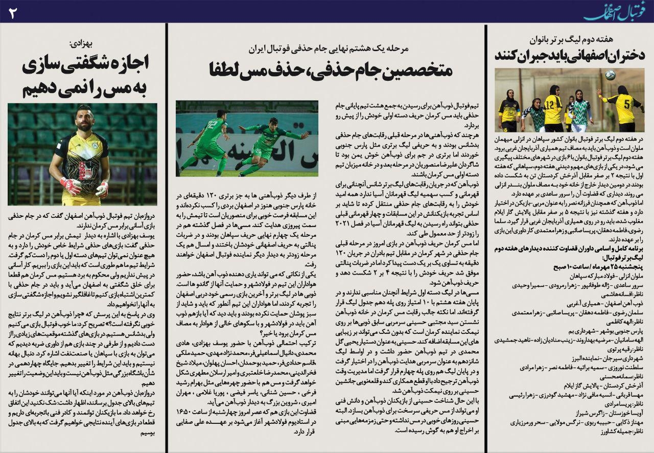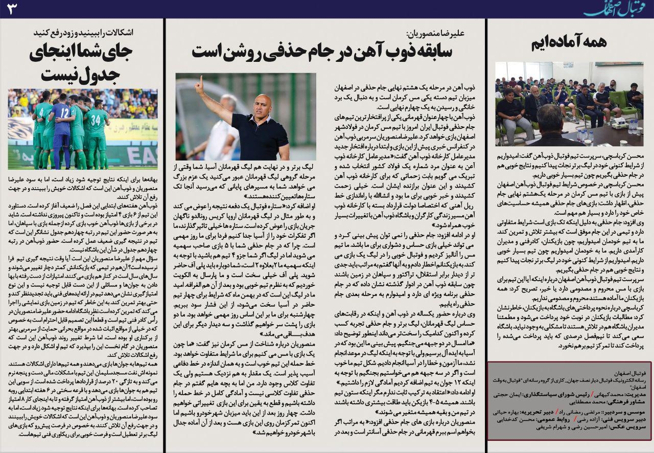 َشماره319 روزنامه الکترونیک فوتبال اصفهان چهارشنبه 24 مهر 98 روزنامه الکترونیک فوتبال اصفهان چهارشنبه 24 مهر 98 با محوریت پوشش اخبار تیم های فوتبال سپاهان و ذوب آهن منتشر شد.