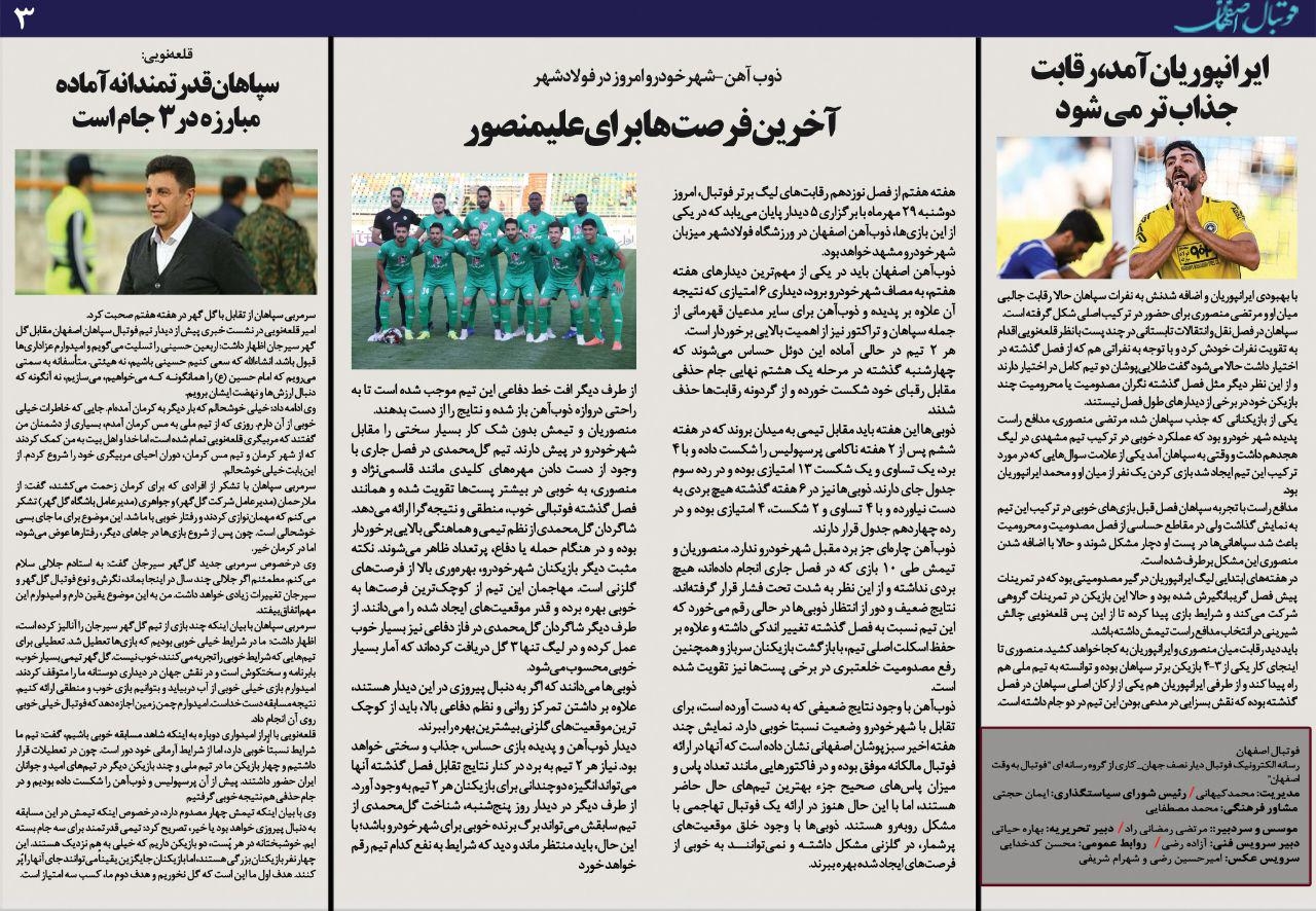 شماره322 روزنامه الکترونیک فوتبال اصفهان دوشنبه 29 مهر 98 روزنامه الکترونیک فوتبال اصفهان دوشنبه 29 مهر 98 با محوریت پوشش اخبار تیم های فوتبال سپاهان و ذوب آهن منتشر شد.