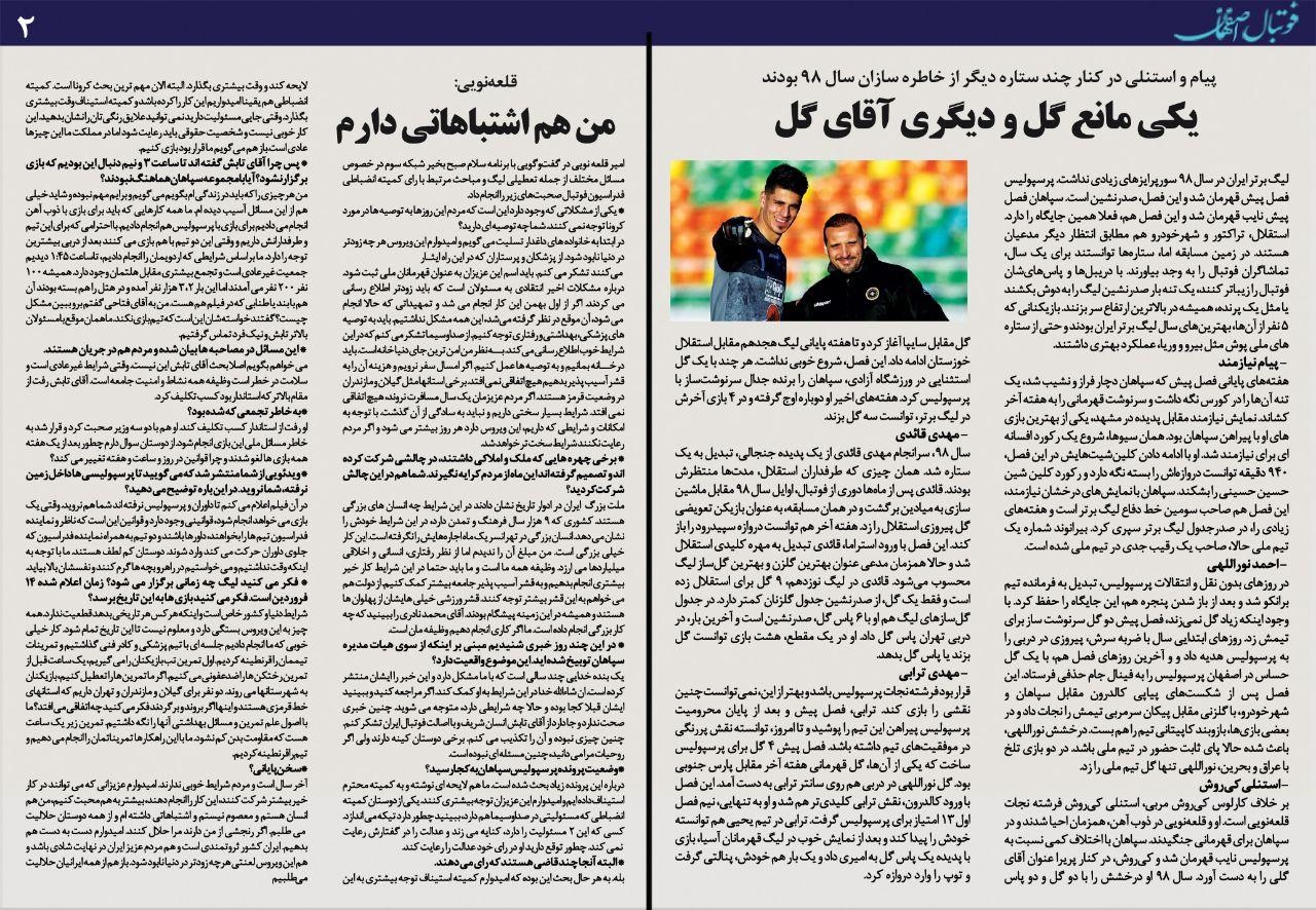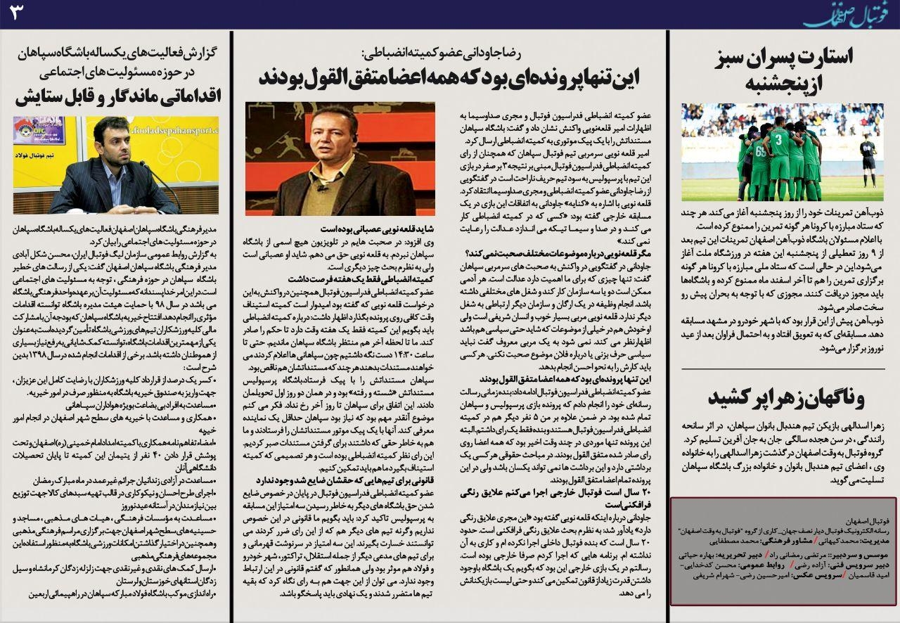 شماره 425 روزنامه الکترونیک فوتبال اصفهان چهارشنبه 21 اسفند 98 روزنامه الکترونیک فوتبال اصفهان چهارشنبه 21 اسفند 98 با محوریت پوشش اخبار تیم های فوتبال سپاهان و ذوب آهن منتشر شد.