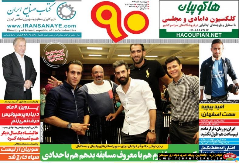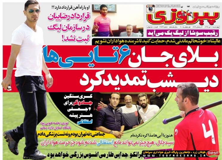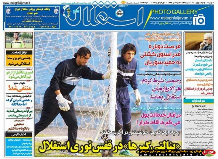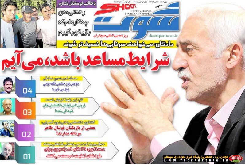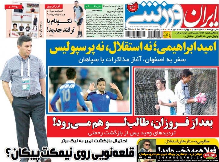 مطبوعات ورزشی کشور روزنامههای صبح چهارشنبه، 10 تیر شامل صفحه یک روزنامههای: ابرار ورزشی، شوت، گل، نود، خبر ورزشی، ایران ورزشی، هدف، پیروزی، استقلال