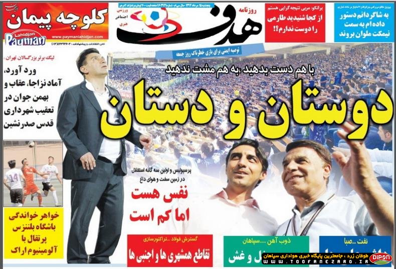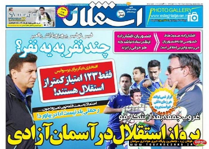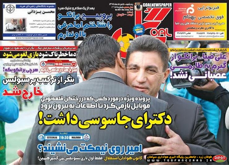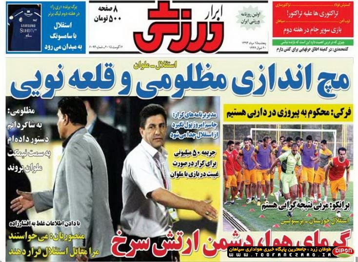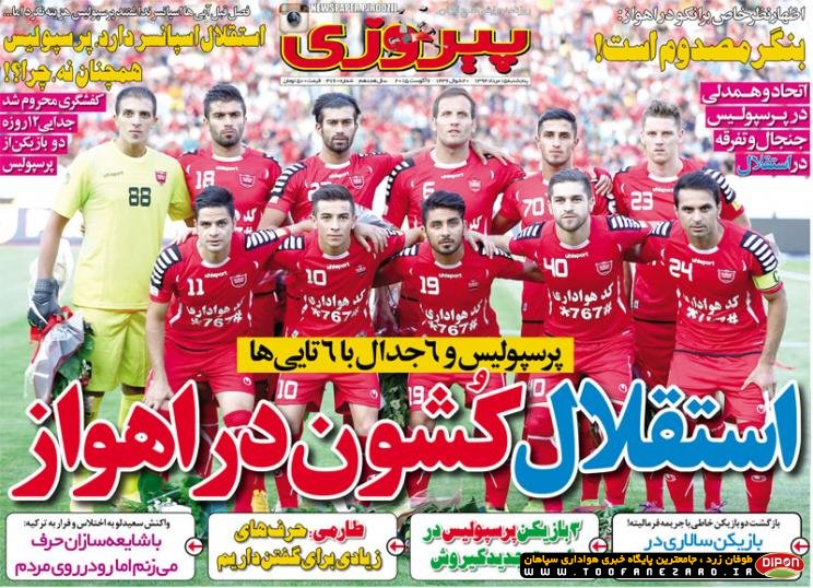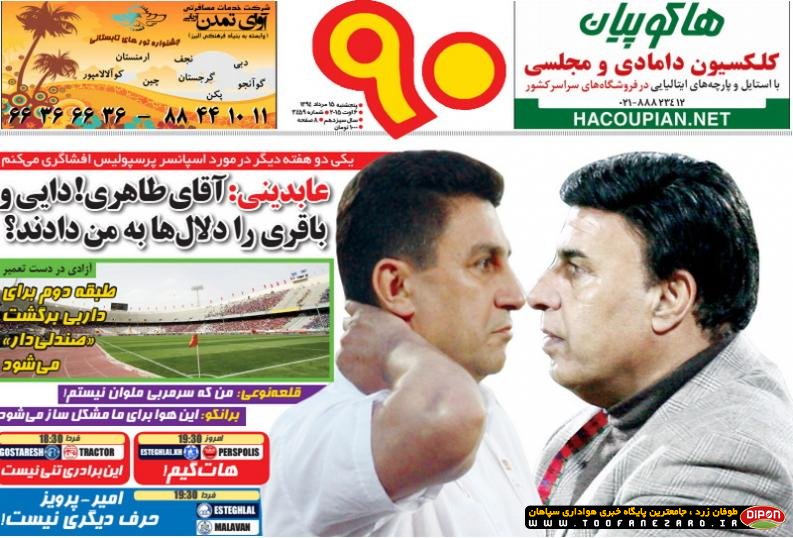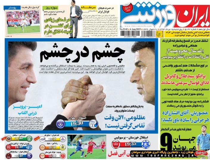 مطبوعات ورزشی کشور روزنامههای صبح پنجشنبه، 15 مرداد شامل صفحه یک روزنامههای: خبر ورزشی، گل، ابرار ورزشی، پیروزی، استقلال جوان، نود، ایران ورزشی، هدف